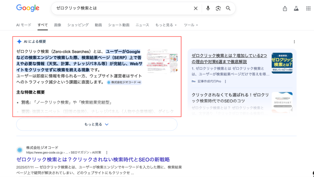 ゼロクリック検索では、情報の出典として企業名やサイト名が表示されることはあっても、ユーザーの行動は検索結果画面内で完結する傾向があります。